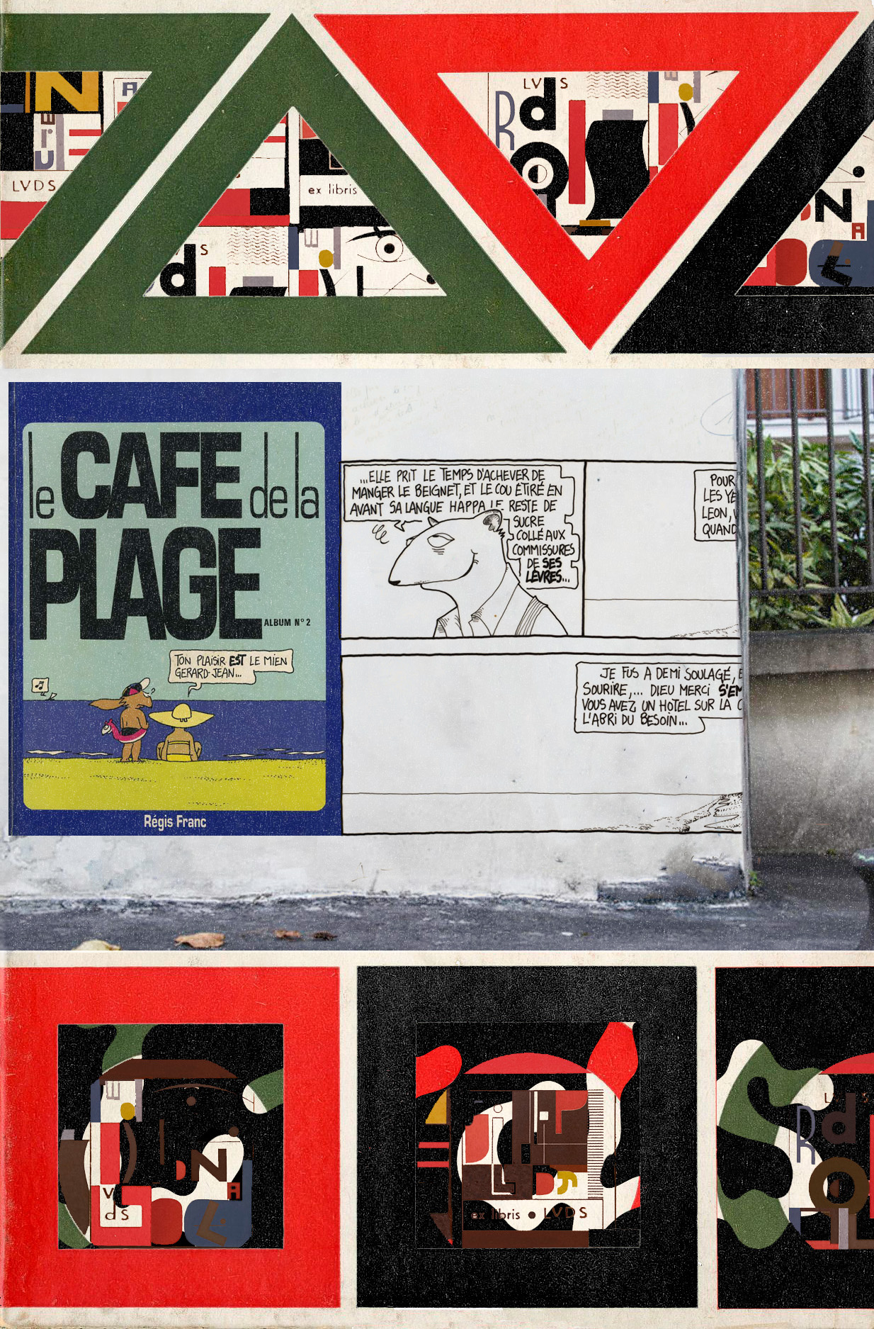 , he jugado con esa necesidad de establecer una imagen en la que las historias de Régis Franc (Le cafe de la page (1977) y Sunset Corridor (1983), entre otras) dan buena muestra de su talento como dinamitero gráfico, en este caso de las viejas glorias de celuloide. La presente nota se ha hecho a través del kollage, de personajes separados de sus plantillas narradoras, espacios que probablemente no existen, pero que de algún modo deberían haber existido. Varias veces se oyen tijeretazos de voces entrecortadas. De todas formas, acabarán recortándose con unas tijeras, en una delicada blandura, un pie de nota herida. No se me escapa que presentar estos fragmentos de manera seguida desvirtúa en cierta medida su sentido original.